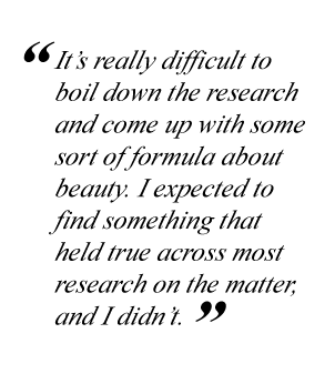 A. I was fascinated by all the contradictions contained within the scholarly and scientific research on what constitutes human beauty. So many of the things that we think are universal traits of beauty—waist-hip ratio, symmetrical features—have a story that’s way more nuanced than “men like women who have little waists.” Which isn’t to say that all those things are total bunk, just that it’s really difficult to boil down the research and come up with some sort of formula about beauty. I expected to find something that held true across most research on the matter, and I didn’t.
