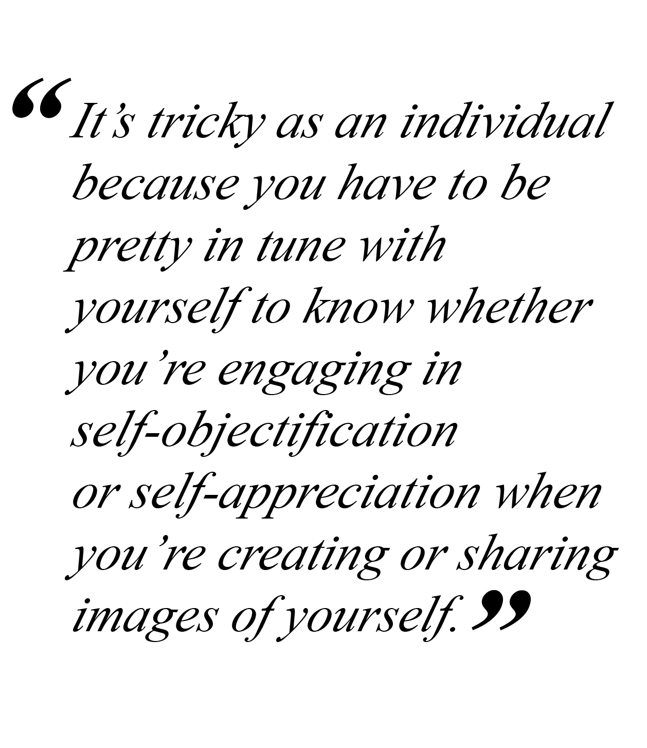 A. The line between self-alienation and the fluid self is in itself fluid—from person to person, from moment to moment, from medium to medium. And it’s tricky as an individual because you have to be pretty in tune with yourself to know whether you’re engaging in self-objectification or self-appreciation when you’re creating or sharing images of yourself. I don’t “get” Snapchat as a user at all, but I’m intrigued by it nonetheless—the people I know who are on it seem to have way more fun with it than they do with other social media, and I think part of that is because it’s designed to be ephemeral. From what I can see, it leads to that idea of “play at being” but without the self-alienation that so easily results when we’re talking about a more static representation of oneself.