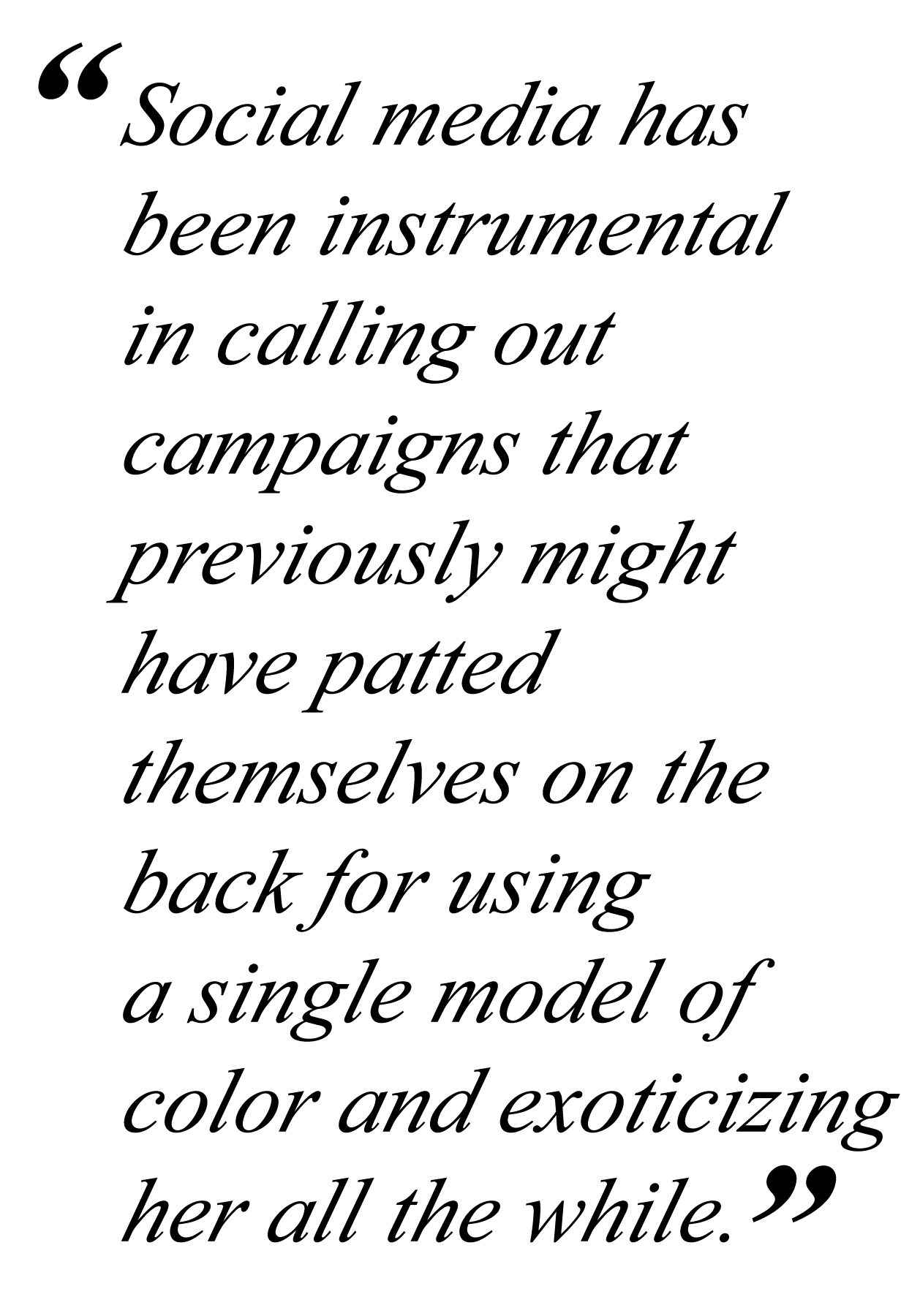 There’s a second shift that’s happened in the past few years, with ad campaigns making some progress in representing groups that have been historically underrepresented. Social media has been instrumental in calling out campaigns that previously might have patted themselves on the back for using a single model of color and exoticizing her all the while. I do see it as an encouraging signal of where America is with understanding that the default American isn’t necessarily a straight white girl who appeals to the male gaze. Media and advertising outlets still figuring out how to be more representative, and there have been missteps there, but I think that it’s going to continue to get better not only in numbers of people represented but also in quality instead of tokenism. At least, I hope so. We’ve got a ways to go, and what people in power need to do is listen to people who have been underrepresented, or misrepresented, and trust their experiences and reactions. If you’re a cis white dude who’s genuinely concerned about these things you might think you’re being progressive by casting a Latina as a white woman’s “spicy” sidekick, but when Latinas roll their eyes, you’ve got to listen to that.